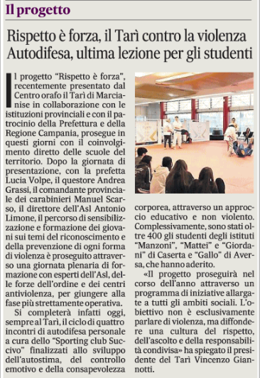 Il progetto "Rispetto è forza", recentemente presentato dal Centro orafo il Tarì di Marcianise in collaborazione con le istituzioni provinciali e con il patrocinio della Prefettura e della Regione Campania, prosegue in questi giorni con il coinvolgimento diretto delle scuole del territorio. Dopo la giornata di presentazione, con la prefetta Lucia Volpe, il questore Andrea Grassi, il comandante provinciale dei carabinieri Manuel Scarso, il direttore dell'Asl Antonio Limone, il percorso di sensibilizzazione e formazione dei giovani sui temi del riconoscimento e della prevenzione di ogni forma di violenza è proseguito attraverso una giornata plenaria di formazione con esperti dell'Asl, delle forze dell'ordine e dei centri antiviolenza, per giungere alla fase più strettamente operativa.